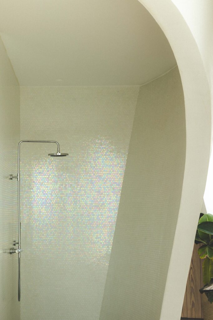 Le bois clair en pin Douglas, la pierre et les reflets nacrés des mosaïques Bisazza